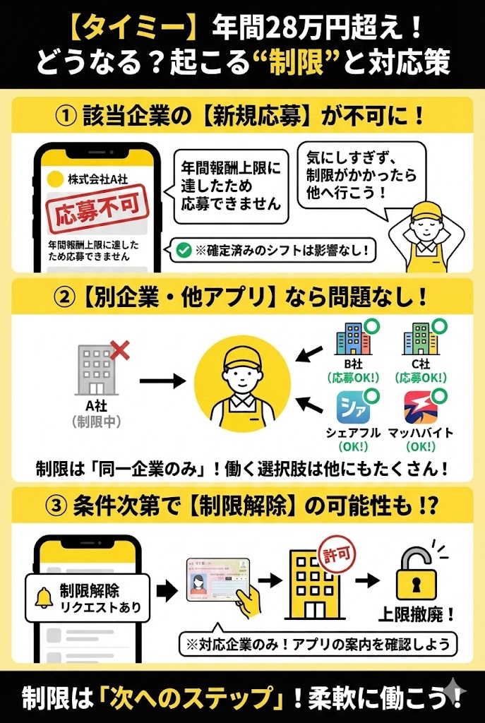 ここでは、「タイミー」で28万円を超えたときに実際に起こる制限を分かりやすく解説します。