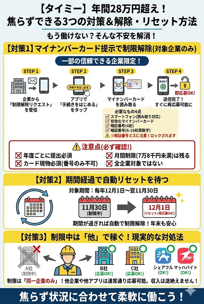 ここでは、「タイミー」で制限がかかった際の解除方法やリセットの手順を詳しく解説します。