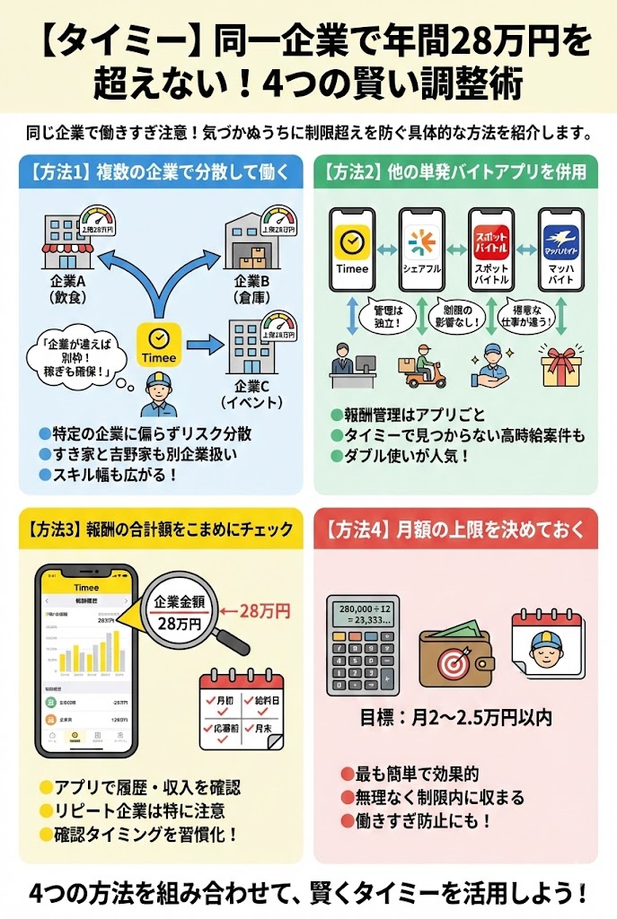 ここでは、「タイミー」内の同一企業で28万円を超えないための調整方法を丁寧に紹介します。