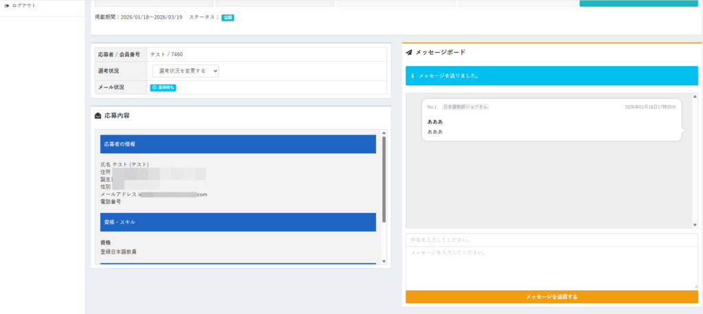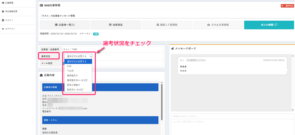 応募者とのやり取りは、画面右側に表示されるメッセージボードをご利用ください。