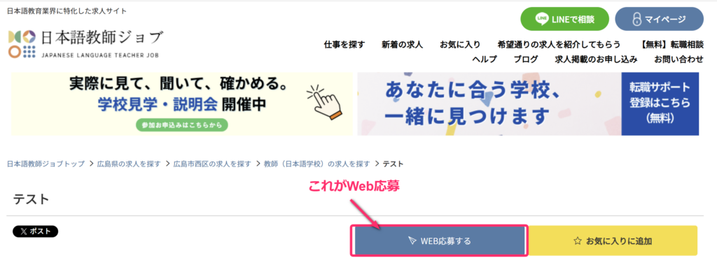Web応募とは、日本語教師ジョブの求人ページに設置されている「求人応募」ボタンから行われた応募を指します。